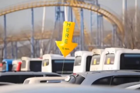 南韓国の石油会社・S-oil社は、キャンペーンとして、遠くから見える明るい黄色の「HERE」と書かれた風船「パーキングバルーン」を駐車場に設置しました。黄色い風船は、空いた駐車スペースにドライバーを早めに導いてくれます。駐車すると、風船は下がり、空いた駐車スペースの部分のみに黄色の風船が立っているようになる仕組みです。