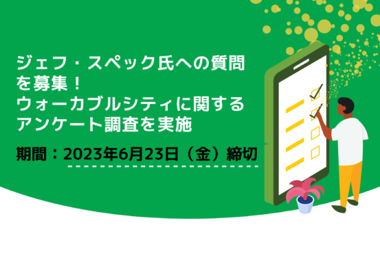 今回、ウォーカブルシティに関する基礎的な調査とともに、「ウォーカブルシティ・国際シンポジウム2023」で登壇するジェフ・スペック氏や日本の行政・実践者・有識者等に対しての質問を募集します。