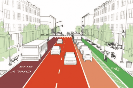 根底にあるデザイン理念は、歩行者再優先、その次に自転車、公共交通利用者、ベンダーや公共サービス提供者といった事業者への配慮です。そして、自家用車利用者については、明確に、優先順位を最後とすると位置付けています。また、15年間 NACTOが蓄積してきたデータから、自動車中心の街路の容量が12300人/時であるのに対し、マルチモーダルなデザインでは30100人/時であるとする算出結果を提示した上で、交通安全性と効率性の面を根拠とした「マルチモーダル」な街路空間コンセプトを貫いています。