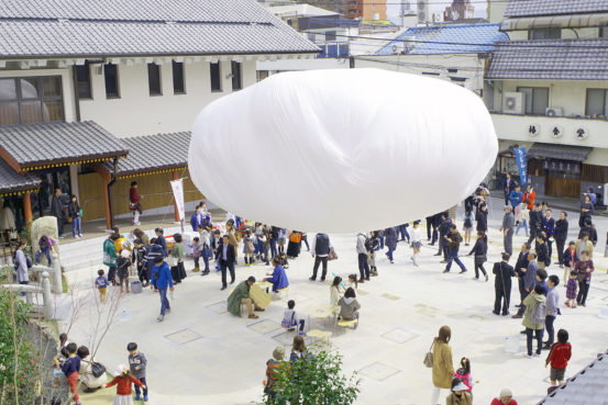 コの字型の建物、2つの公衆浴場に囲まれた、ここは「道後温泉別館 飛鳥乃湯泉(あすかのゆ)」の中庭広場です。(関連記事「子供からおばあちゃんまで雲の下に座ればわくわく! 市民がつくって運営する広場が松山・道後温泉に誕生」)