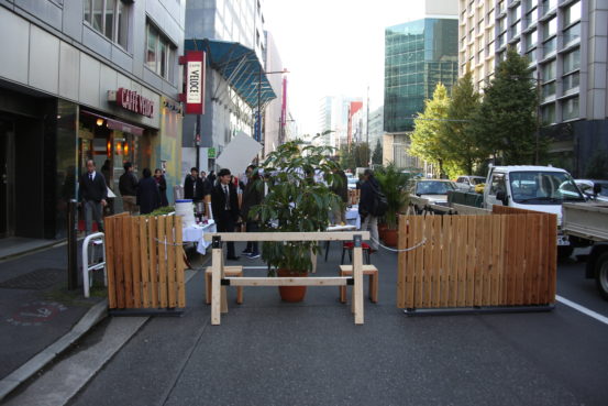 11月に行われた「神田警察通り賑わい社会実験2016」において、ミニ社会実験として実験的にパークレット的空間が試行されました。この社会実験は、①ミニ社会実験とオープンワークショップ、②トークセッションとワークショップ、③アクティビティ調査で構成されています。