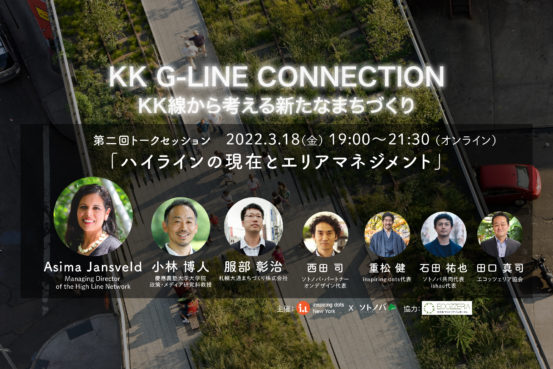 Asima氏には事前にインタビューを行い、運営や収支計画、地域への影響等ニューヨーク市ハイラインに関する最新の情報を収録。本イベントでは、その映像を字幕付きで公開します。また、小林氏と服部氏には国内外のエリアマネジメントの事例紹介やそのあり方について講演いただきます。さらに、KK G-LINE CONNECTION有志メンバーによるハイラインやKK線に関する研究発表を行い、KK線の可能性を議論します。