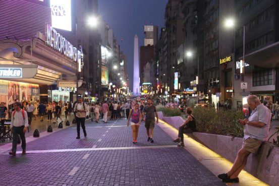 ブエノス・アイレスのコリエンテス通りでは、スライド左下の写真のように昼時間は車道として利用されている道路空間を夜にはスライド右上のように歩行者専用空間にするといった柔軟なマネジメントがされています。