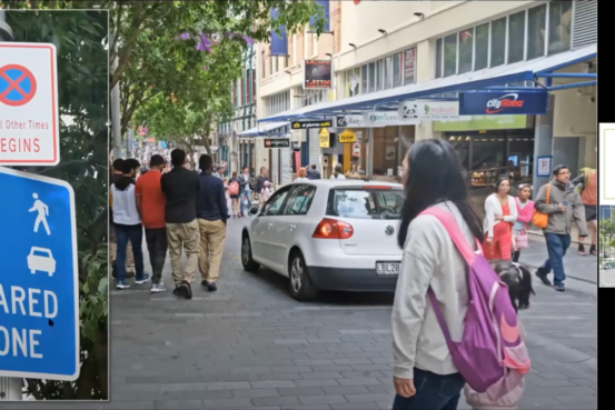 標識にはシェアードゾーンと書かれています。ここでは、人と車が対等に扱われるそうです。車が通行する際、もし前に人が歩いていれば、同じぐらいのスピードでゆっくり、対等で動く必要があります。