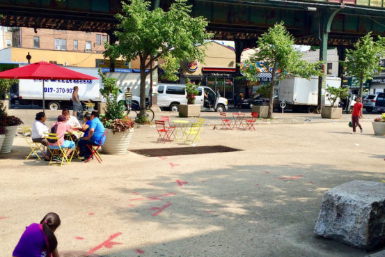 このプラザも、歩行者天国からうまれたものの一つ。ジャクソン・ハイツというブルックリンの住宅地にあり、沿道は公園と学校です。