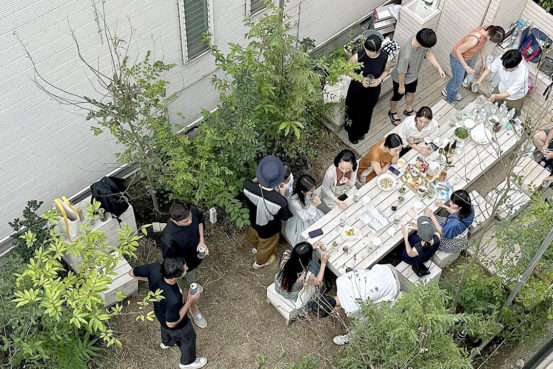 一方で、Comorisはセミパブリックであることを意識した空間でもあり、シェアメンバーではない地域の人々も、曜日限定の公開日に自由に利用できるようにしています。ご近所さん同士でワインを飲んでいる光景が見られたり、スーパーで購入する代わりにComorisで摘んだ大葉をおにぎりにして持ってきてくれる人がいたり。
