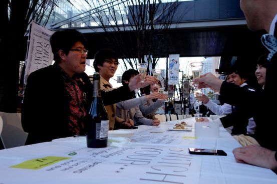 グランフロント大阪の北館と南館の間にある「けやき並木」では、歩道の一部を都市再生特別措置法の特例道路専用区域の指定を受け、普段から歩道の隣接店舗がオープンカフェを行っています。今回のイベントでは、ほぼ指定範囲の全てを使用し長机を直線に並べ、シャンパングラスを傾けながら会話を楽しむ風景がみられました。