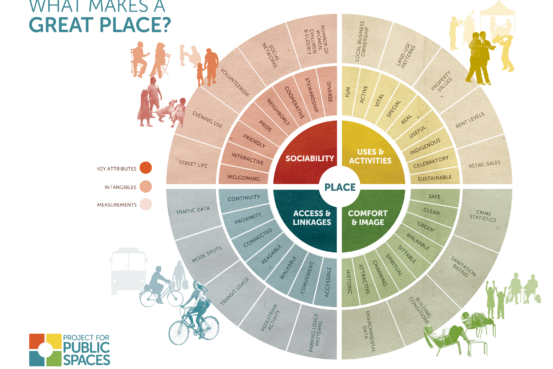 Image by PPS website このプレイス・ダイアグラムは、コミュニティが場所を評価することを手助けするために開発したPPSの一つのツールです。中心部の輪は、場所の重要で有用な特質を表しており、中間の輪は無形の性質を表しており、さらに外側の輪は測定可能なデータを表しています。